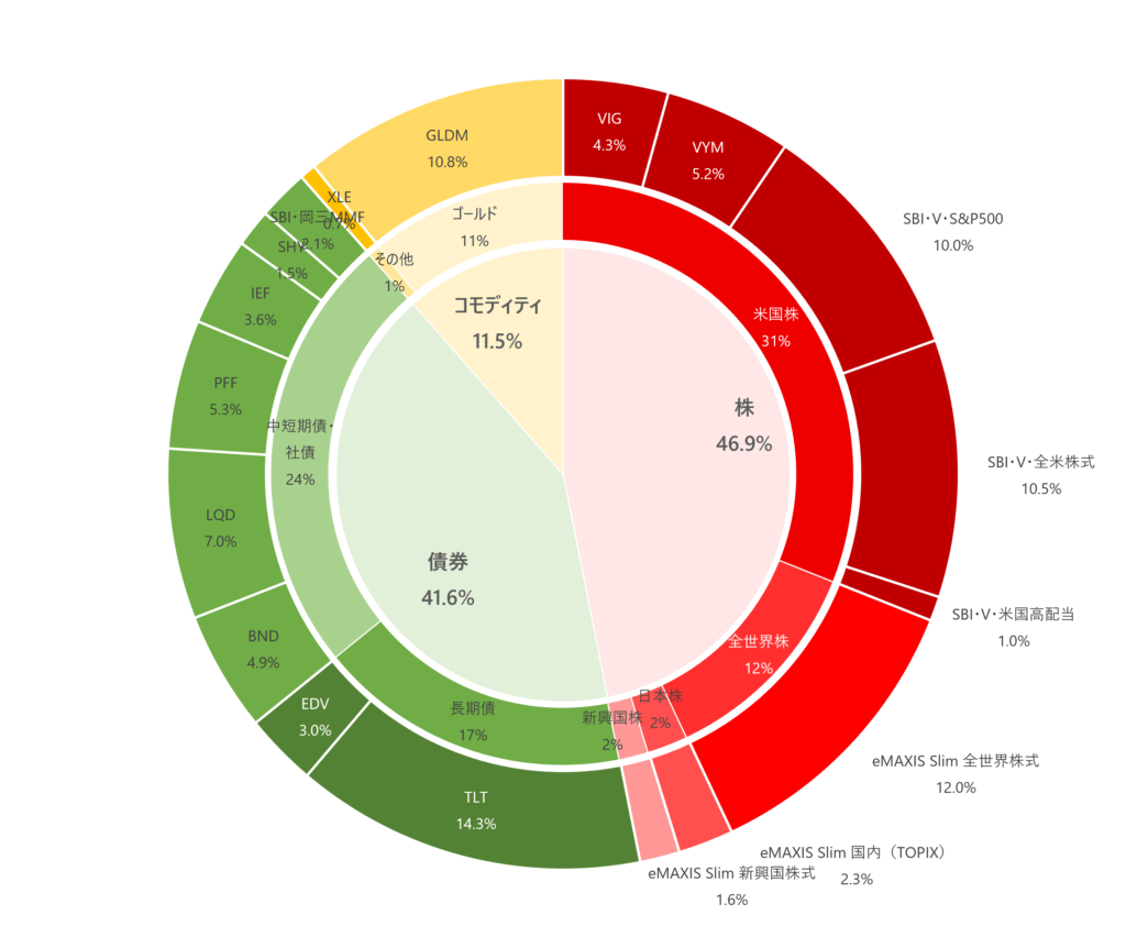 金(ゴールド)の値上がりが続いており、コモディティの比率が上昇しました。