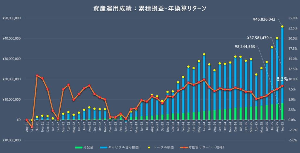 縦棒グラフのうち、緑色が分配金の累計金額で8,244,563円、ブルー色がキャピタル含み損益で37,581,479円となりました。
