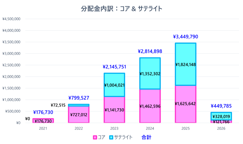 2021年以降、年間累計金額をコアとサテライトに分けると以下の推移となっています。