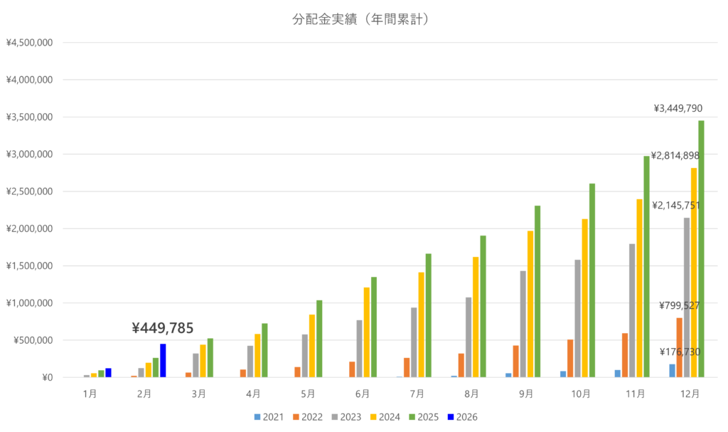 昨年(2025年)11月に買い増ししたJリートの分配金が加わった影響もあり、2月の分配金としては過去を大きく上回る金額になりました。