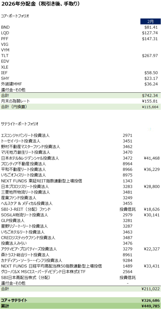 2026年2月の分配金(税引き後)は、円ベースで326,686円となりました。