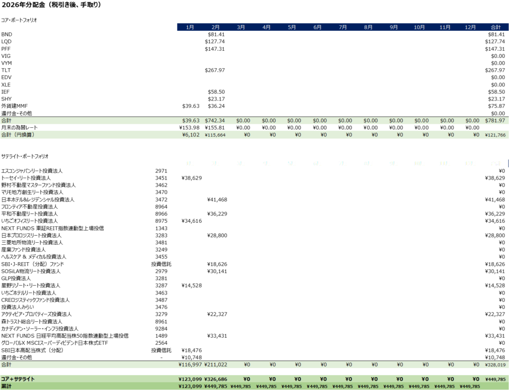 一方、サテライトの分配金については、今後も日本高配当株、Jリートともに買い増していく計画なので、伸びていく見込みです。