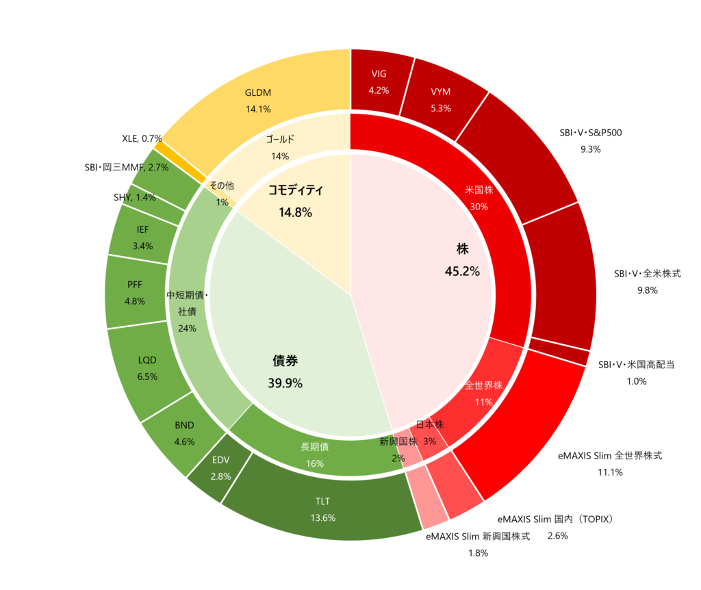コモディティ(ゴールド)が強すぎるため、米ドルの分配金が貯まった分をSBI・岡三MMFに投入して債券の比率を何とか維持した格好です。