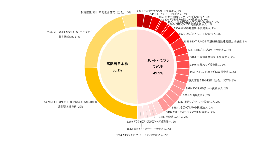 となり、Jリート・インフラファンドと高配当日本株の比率50:50の理想形になりました。