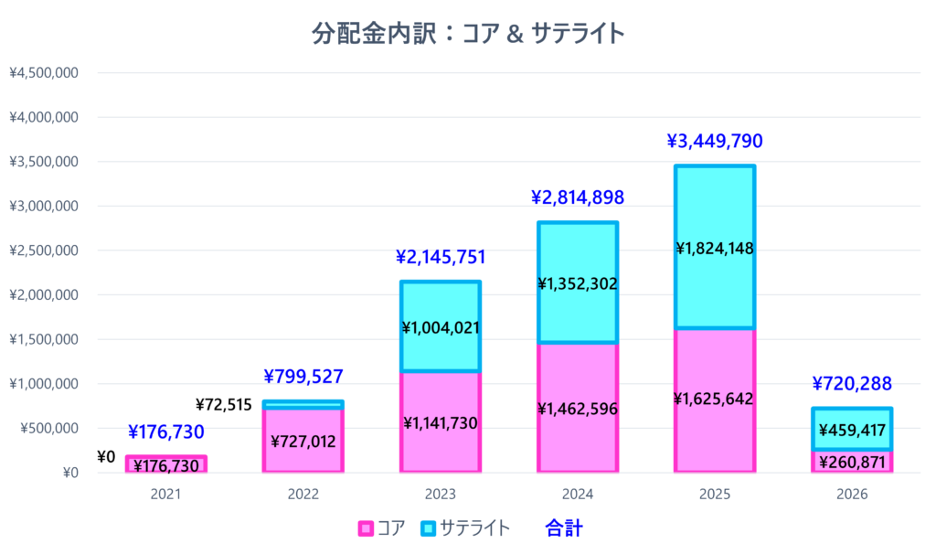 2021年以降、年間累計金額をコアとサテライトに分けると以下の推移となっています。