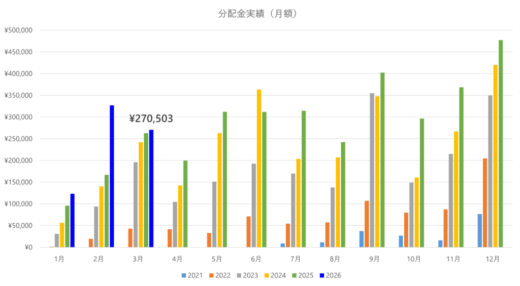2026年3月の分配金(税引き後)は、円ベースで270,503円となりました。